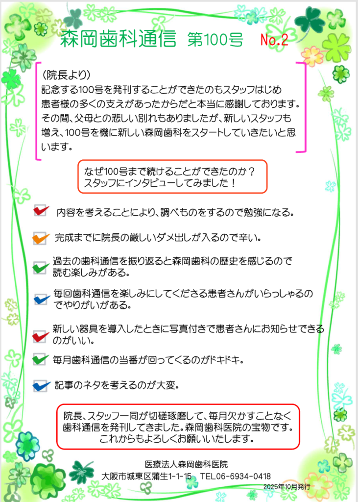 森岡歯科通信 記念すべき第100号(2025年10月)