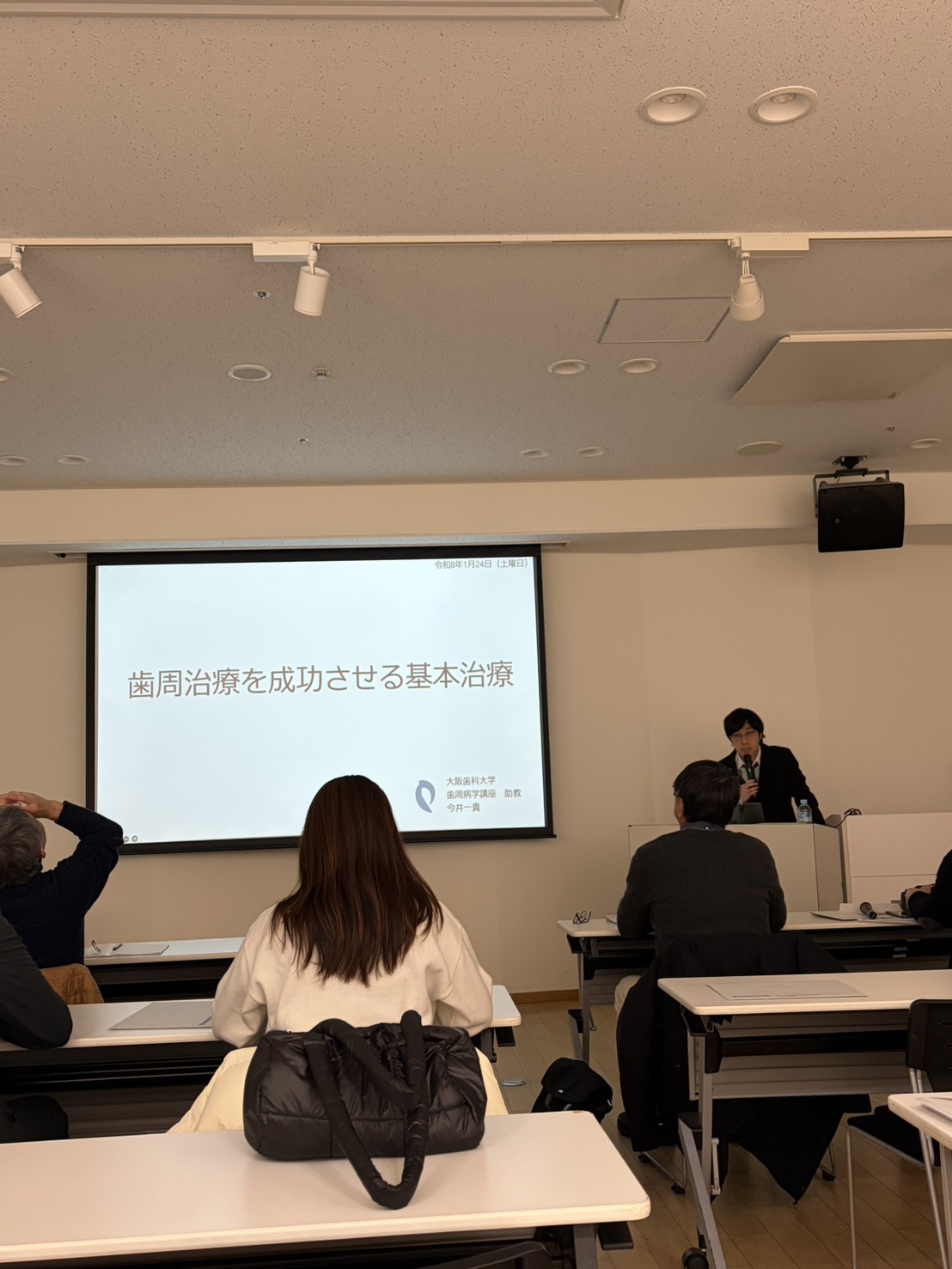 大阪歯科大学、歯周病学講座助教の今井先生が講師に来てくださり、歯周病の歴史や基本治療の大切さ、咬合性外傷など実際の症例までとても興味深いお話を聞くことができました。